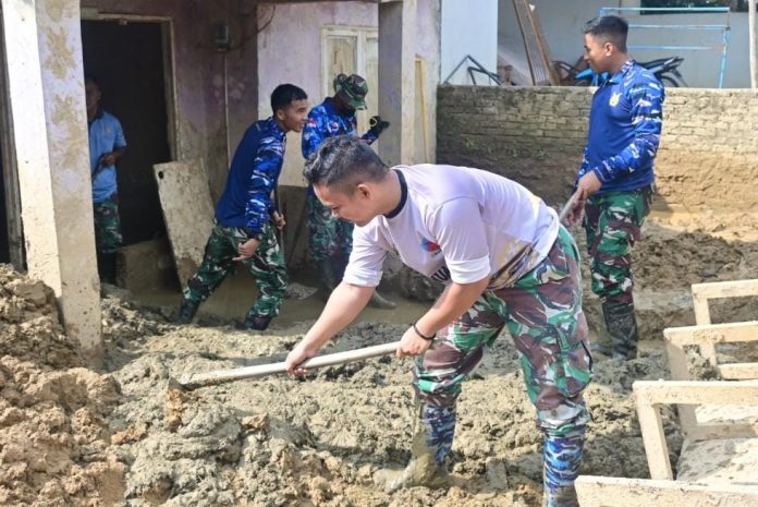 Para prajurit bersama warga membersihkan lumpur, sampah, dan sisa material banjir yang masuk ke dalam rumah maupun area permukiman. Upaya tersebut dilakukan untuk mempercepat pemulihan kondisi lingkungan agar masyarakat dapat kembali menjalankan aktivitas sehari-hari.